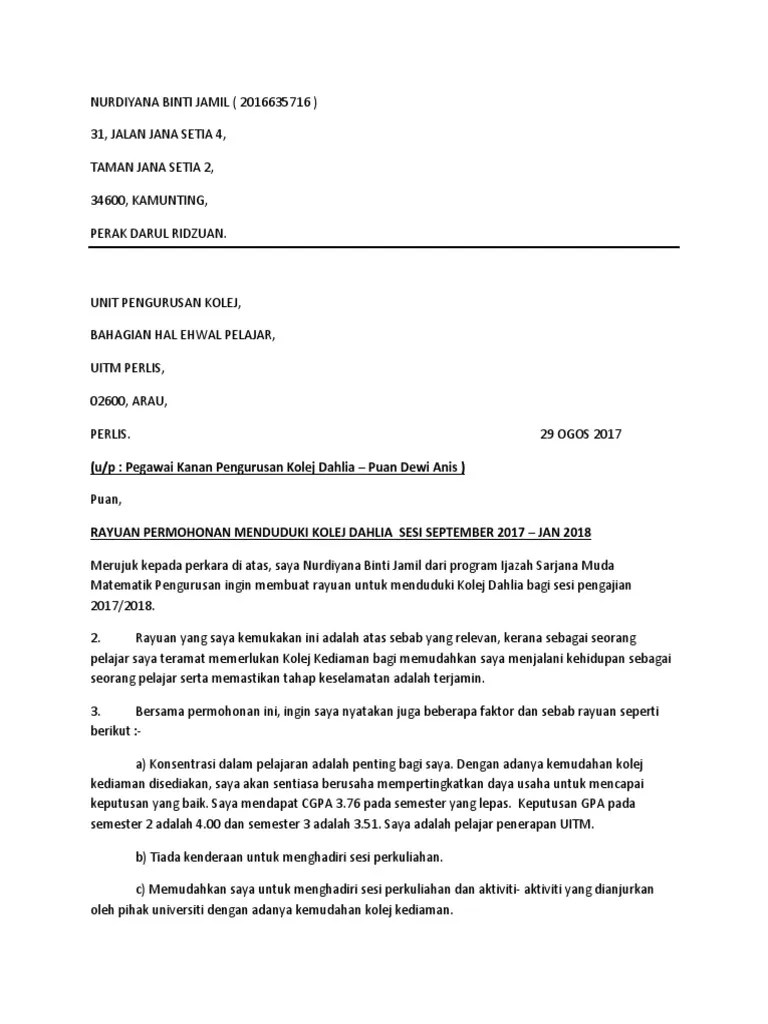Contoh surat rayuan menduduki kolej kediaman uitm. Contoh surat penangguhan dan pengur. Surat rekomendasi adalah suatu surat yang dibuat oleh pimpinan yang berisi tentang keterangan untuk mengutus seseorang baik untuk keperluan tertentu maupun permintaan. Kenyataan akhbar kpk 30 ogos 2016 penjualan sijil cuti. Matrik iet 120007 ingin membuat rayuan untuk tinggal di asrama kolej kediaman raja dr nazrin shah (kk12) bagi kemasukan semester 1 sesi 2015/2016 setelah gagal mendapat kelayakan menduduki kolej yang.