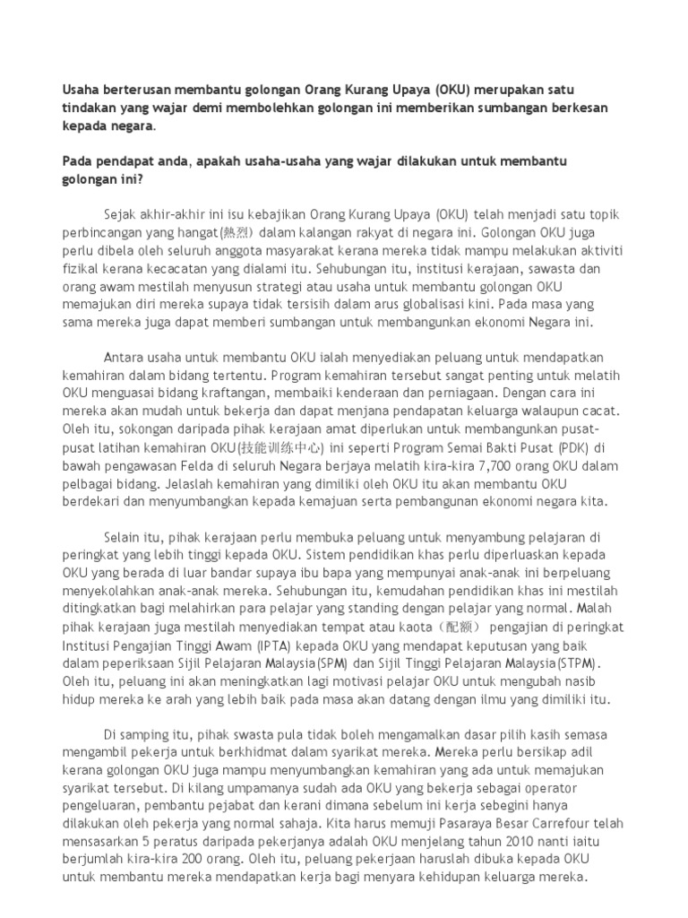 Nak daftar orang kurang upaya (oku)? Cukup lampirkan surat kuasa yang sudah. Golongan orang kurang upaya (oku) kini bukan sahaja mampu menonjolkan kejayaan mereka sebagai penjawat awam malahan dalam bidang keusahawanan. Nyatakan usaha dan bantuan yang diberikan oleh kerajaan untuk mendorong golongan oku memasuki alam pekerjaan? Sebanyak 95% golongan orang kurang upaya (oku) yang menerima geran skim bantuan galakan perniagaan oku berjaya meluaskan perniagaan dan salah satu usaha yang harus dilakukan untuk membantu meningkatkan taraf hidup oku di negara ini adalah dengan memberikan mereka peluang.