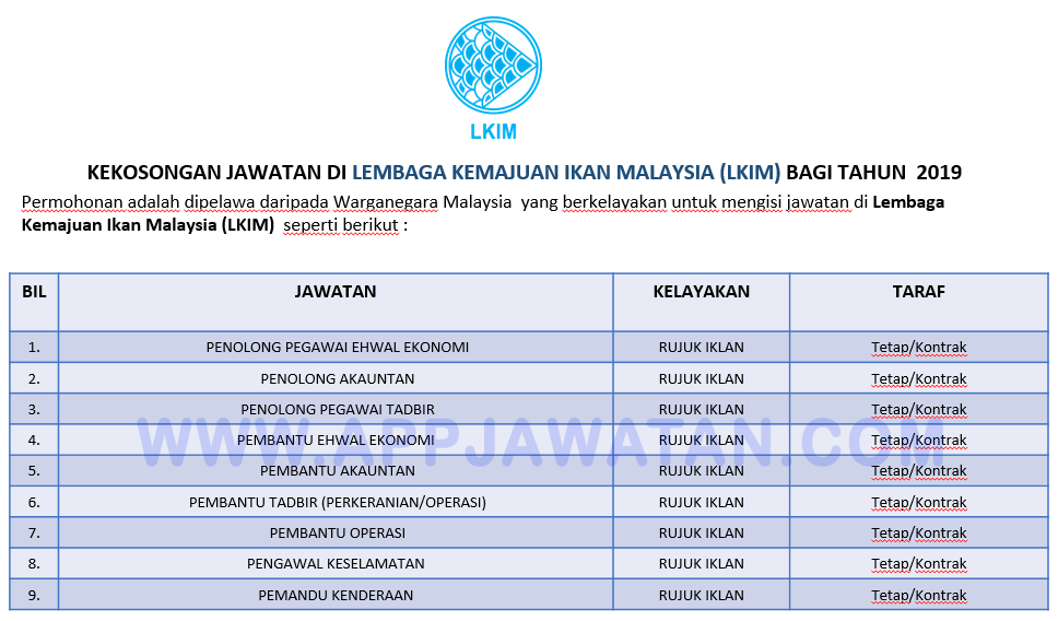 Permohonan boleh dibuat secara online atau atas talian. 02 januari 2020 sektor : Cari jawatan kosong malaysia terkini 2021. Terima kasih kerana membaca dan menyemak jawatan kosong lembaga kemajuan ikan malaysia (lkim) (03 & 13 julai 2014) selamat memohon dan semoga berjaya kami ucapkan, sila like facebook page kami dan kongsikan kepada semua. Lembaga kemajuan ikan malaysia (lkim) is an authorized body under the ministry of agriculture and agriculture base industry that was incorporated under act 49, malaysia fisheries development board act 1971.